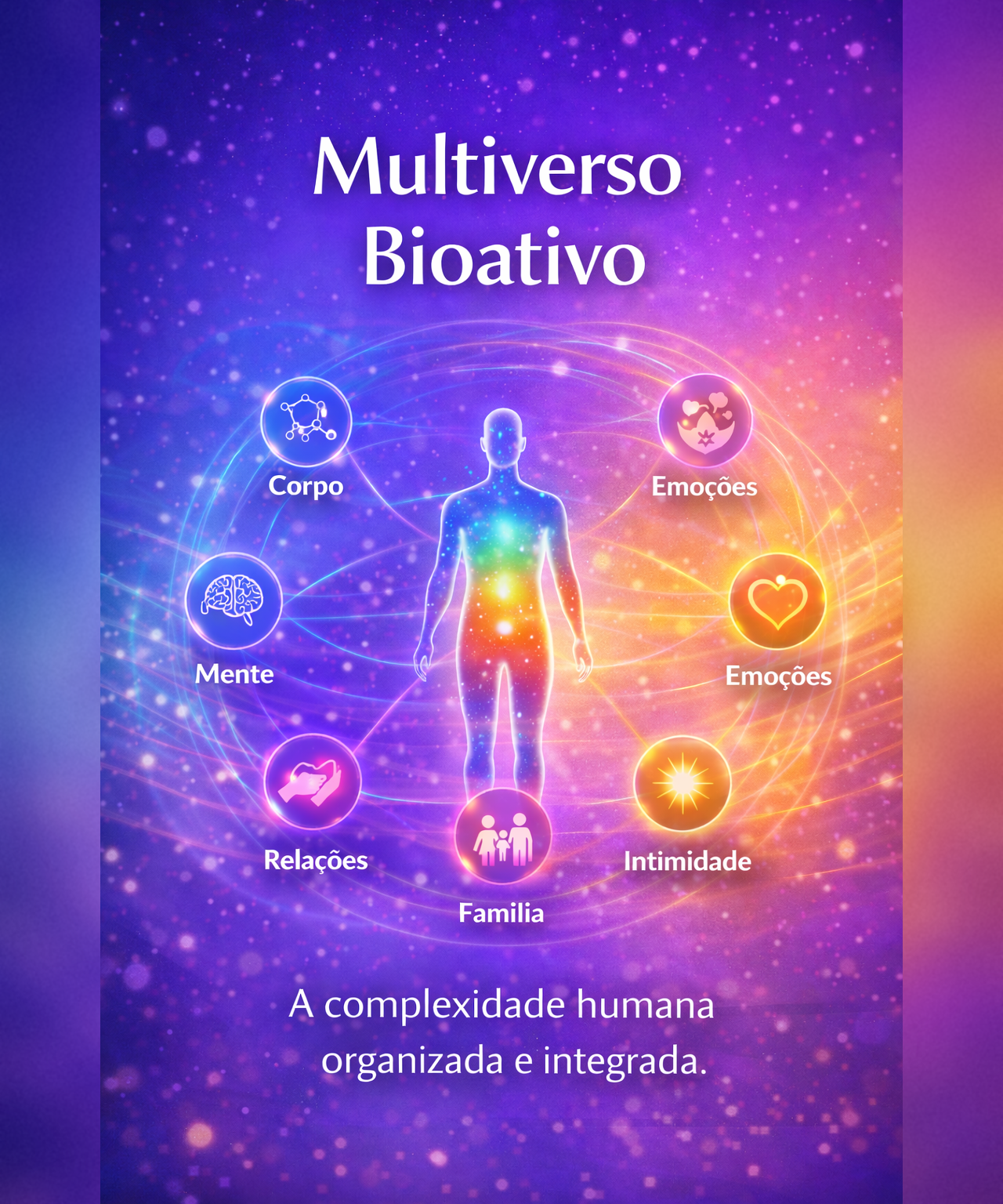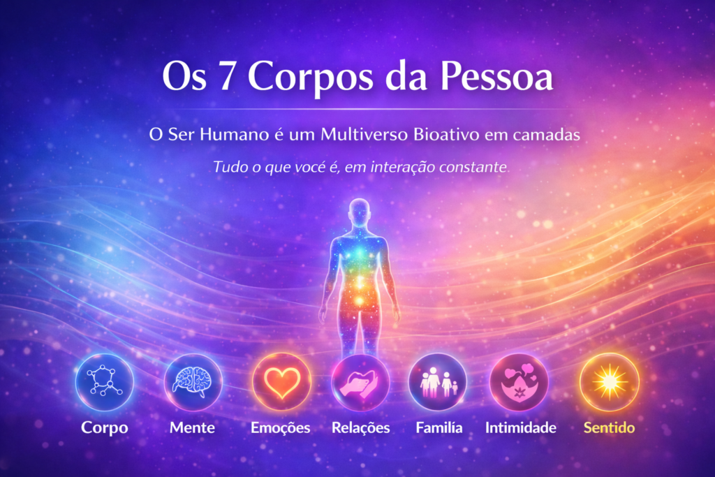 Os 7 Corpos da Pessoa são um mapa clínico para enxergar o Ser Humano como ele realmente é: um Multiverso Bioativo em camadas, onde corpo, mente, emoções, relações, família, intimidade e sentido se influenciam continuamente. Cada “corpo” não é um compartimento isolado — é uma dimensão viva do funcionamento humano, com linguagem própria, sinais próprios e impacto direto sobre as demais.